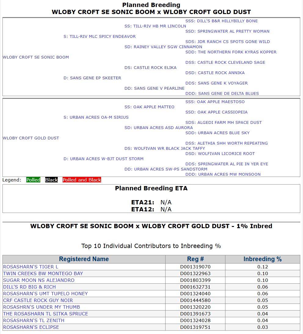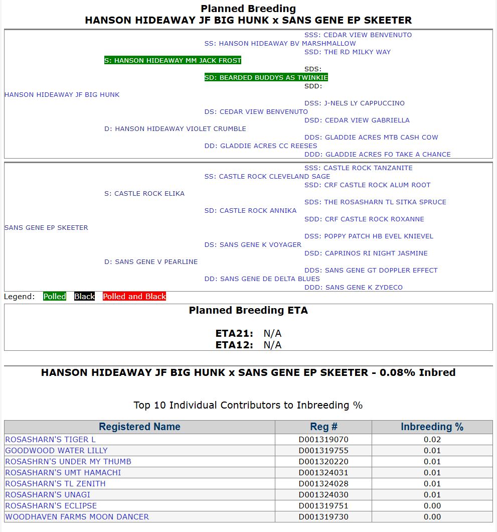 I'm very excited for this breeding. Betty has the nicest teats/orifices of my Nigerians. She is a joy to hand milk. Betty's dam peaked at 6.2 lbs. of milk per day. Hunk's pedigree is amazing. His dam has 2 champion legs and peaked at 5.4 lbs. of milk per day. Betty will be on milk test in 2026. Click on the parents' names to go to their webpage and read all about them.