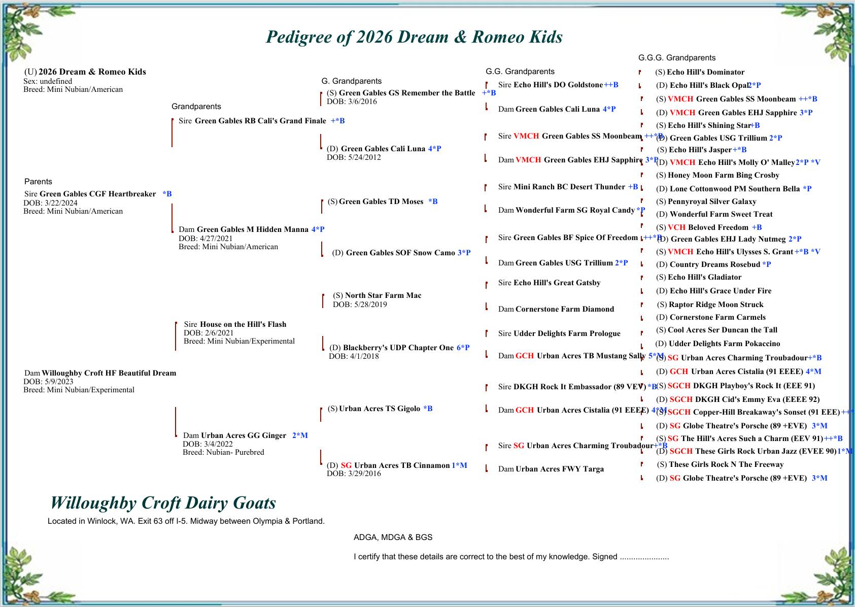 And yet another exciting breeding. Dream was a first freshener in 2025 and has a very promising udder. It's globular with nicely placed teats and easy-to-milk orifices. Her skin is very dairy and buttery soft. We can't wait to see how her udder blossoms for her second freshening. Dream has won Reserve Champion in a live show. Romeo is a phenomenal buck with exceptional udders behind him. His dam earned her milk star as a first freshener! His dam also won Reserve Champion, Best Udder In Breed, and best Udder In Show in the Fall 2024 V-Show. These kids have fabulous udders behind them. Romeo should improve milk production. We are very excited for the kids from this breeding. They should have beautiful udders, great milk production, and show potential! Click on the parents' names to go to their webpage and read all about them.